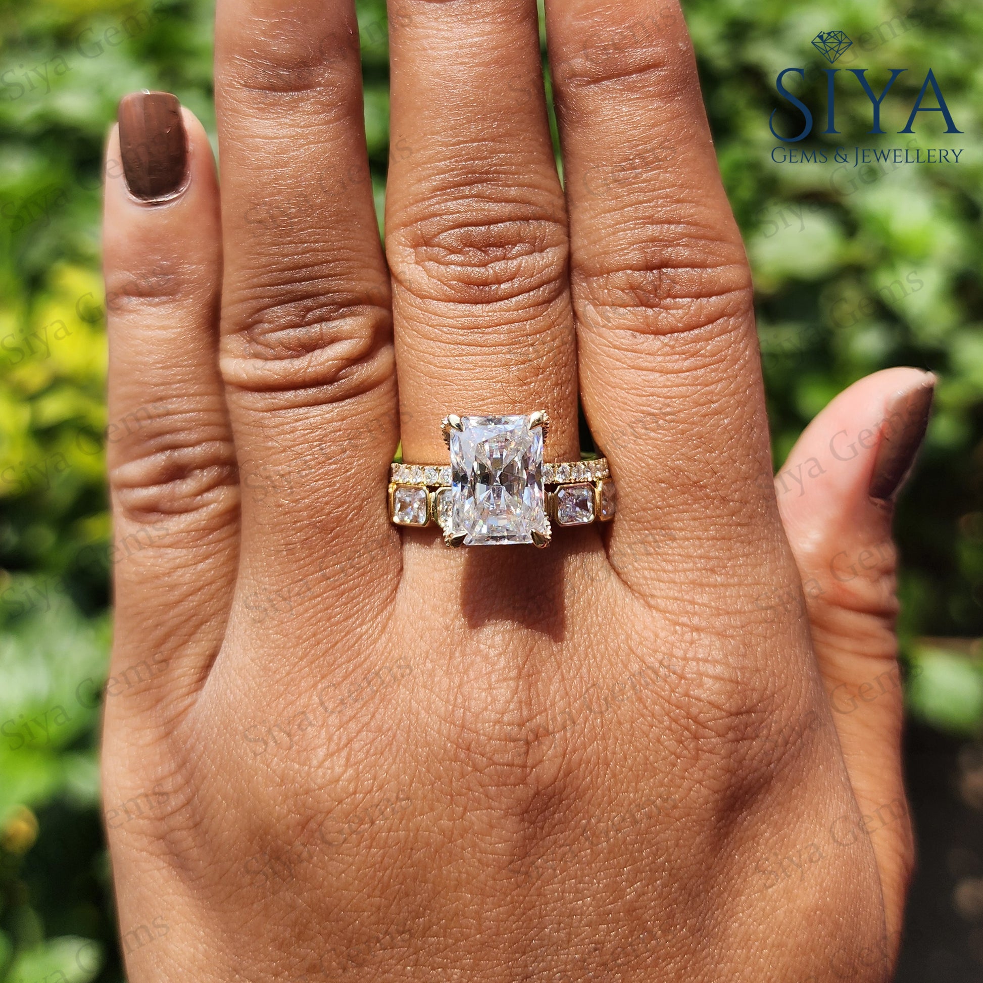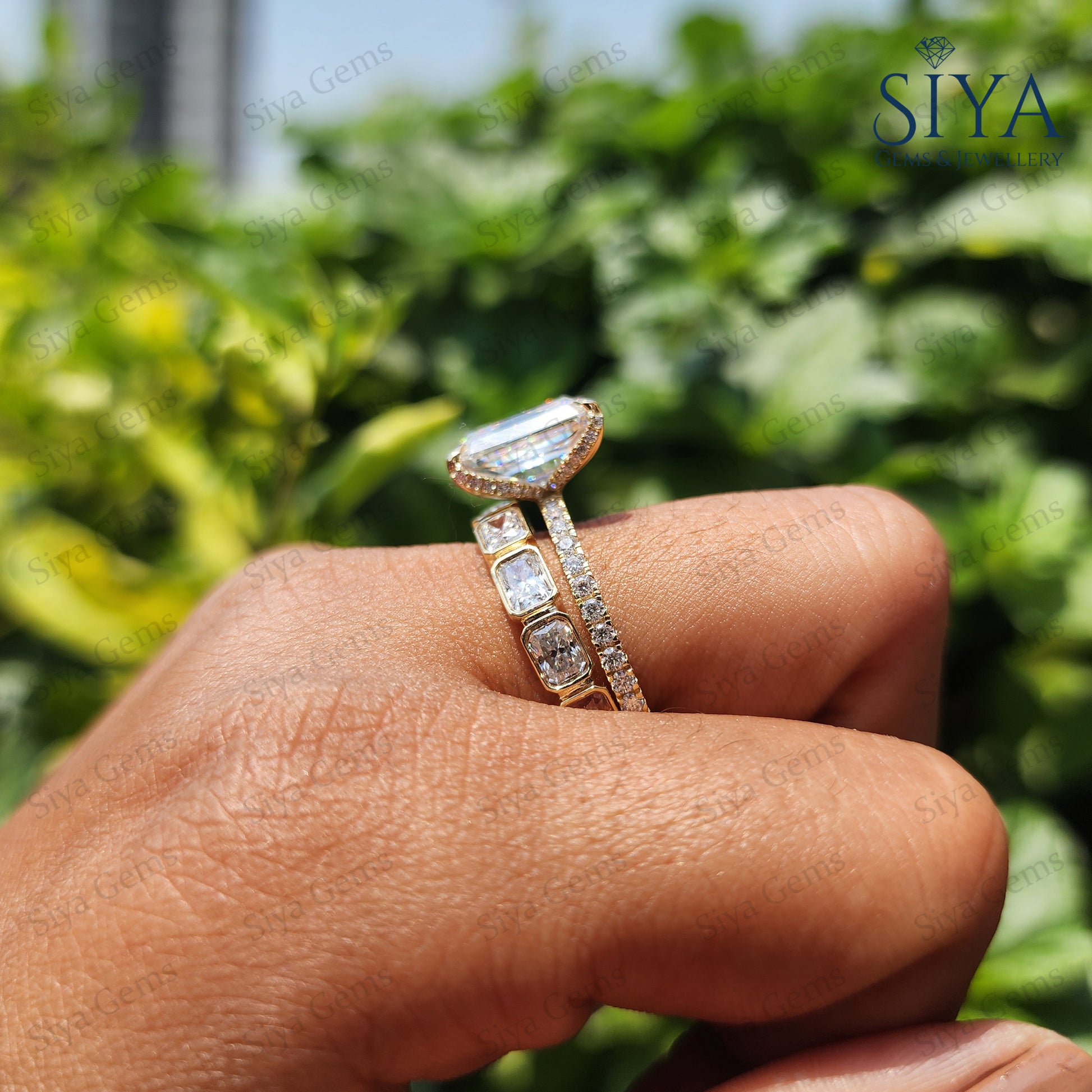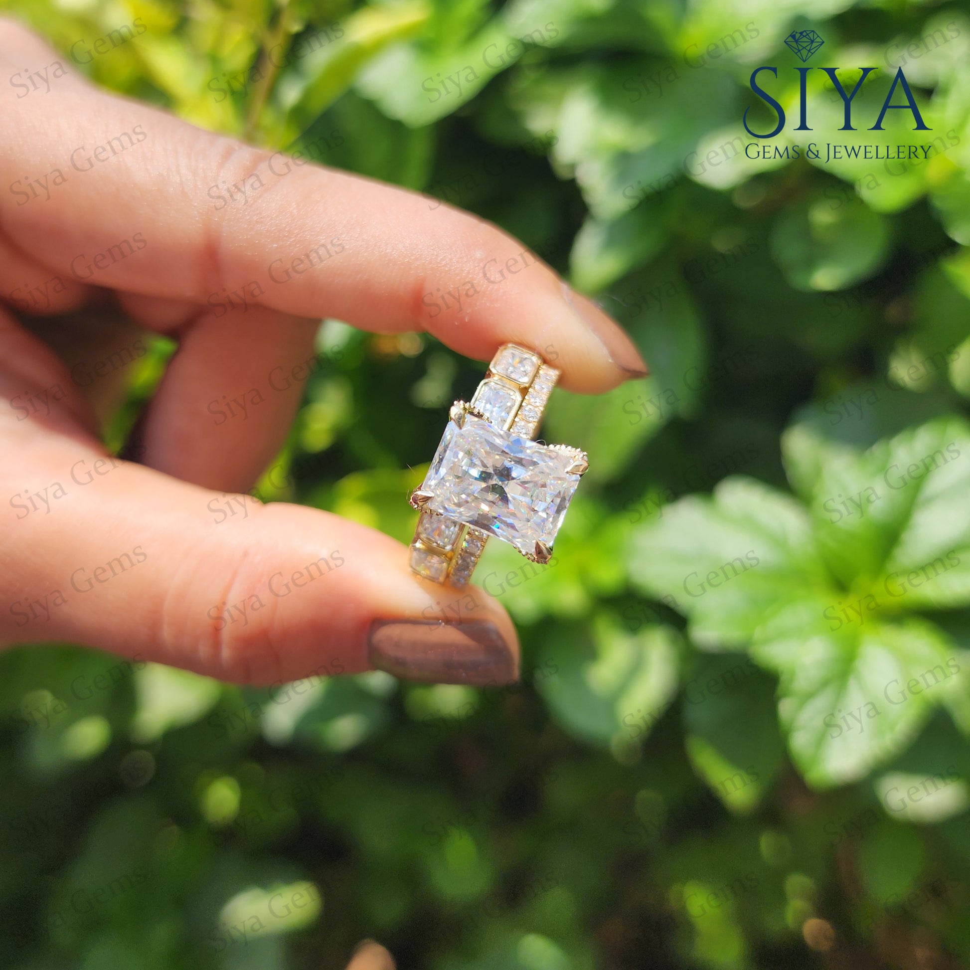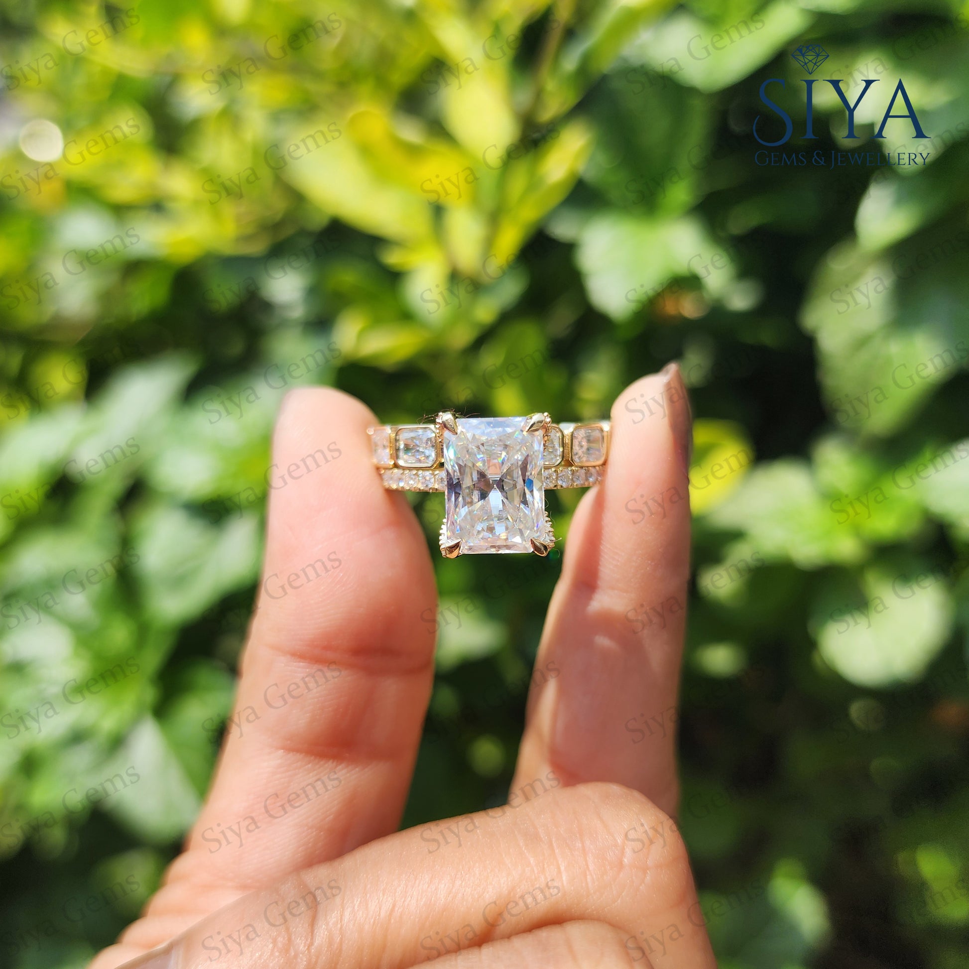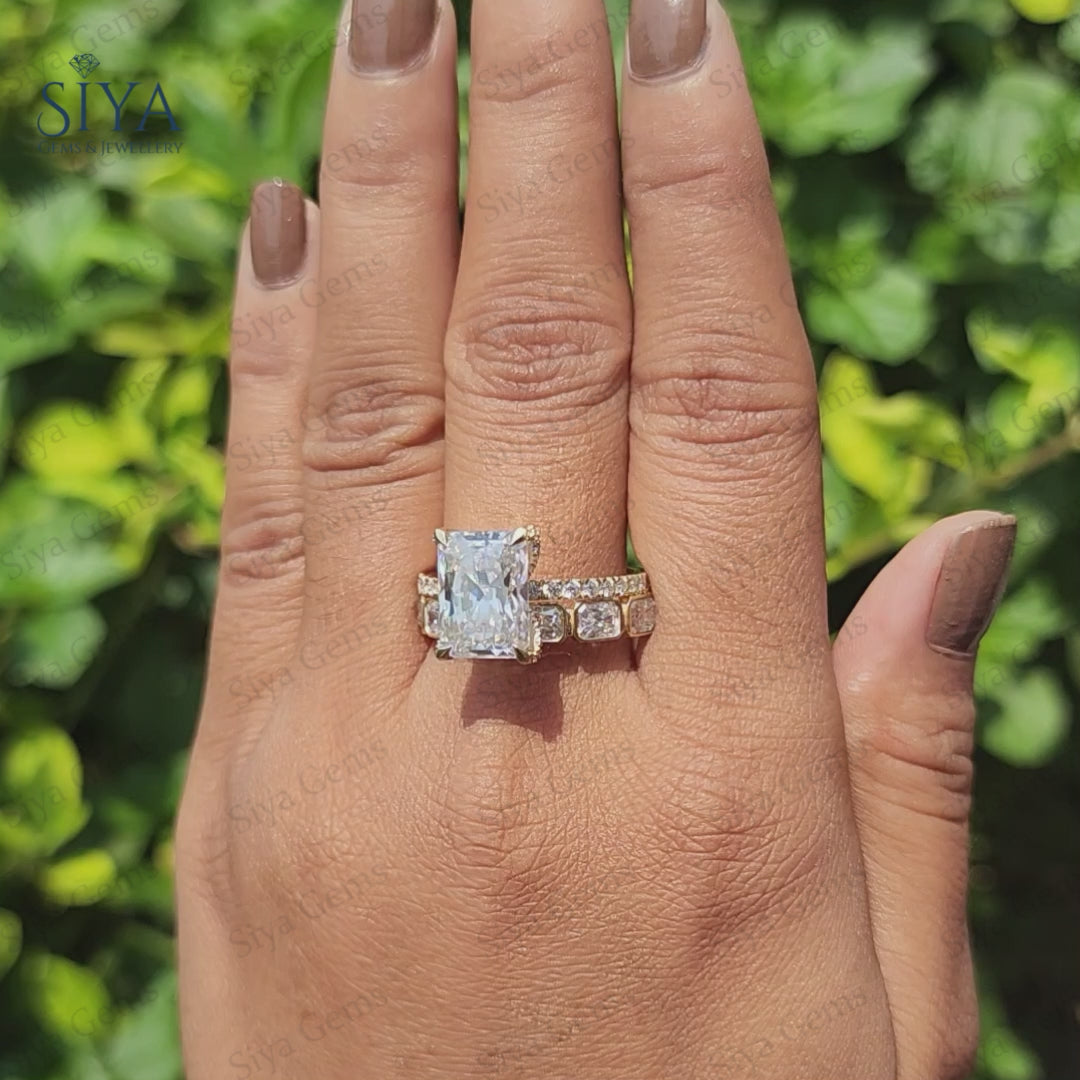 Radiant Cut 3CT Moissanite Engagement Ring Bridal Set, beautifully crafted in luxurious yellow gold. Featuring a dazzling radiant-cut center stone with exceptional brilliance and clarity, this elegant ring set is designed to capture attention from every angle.