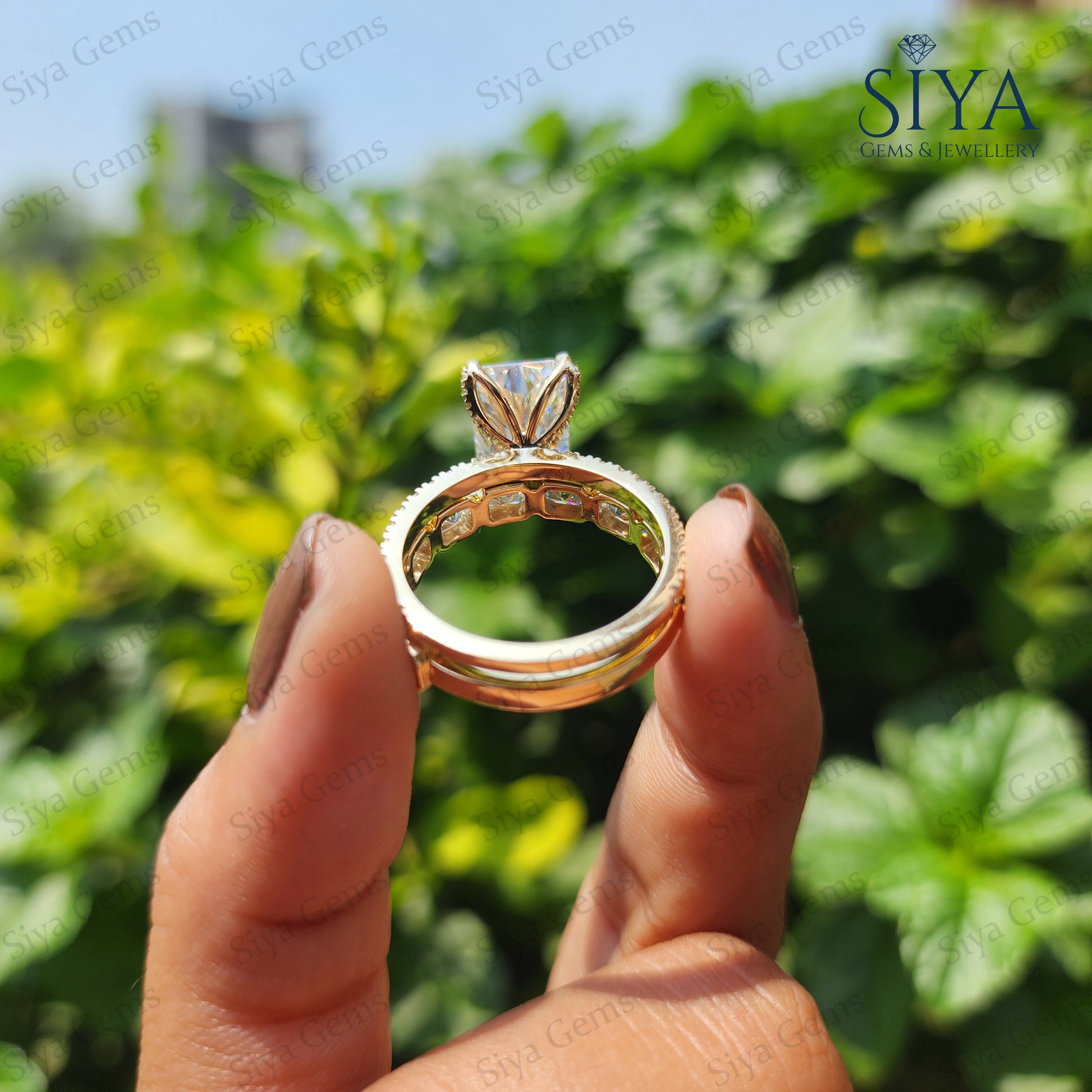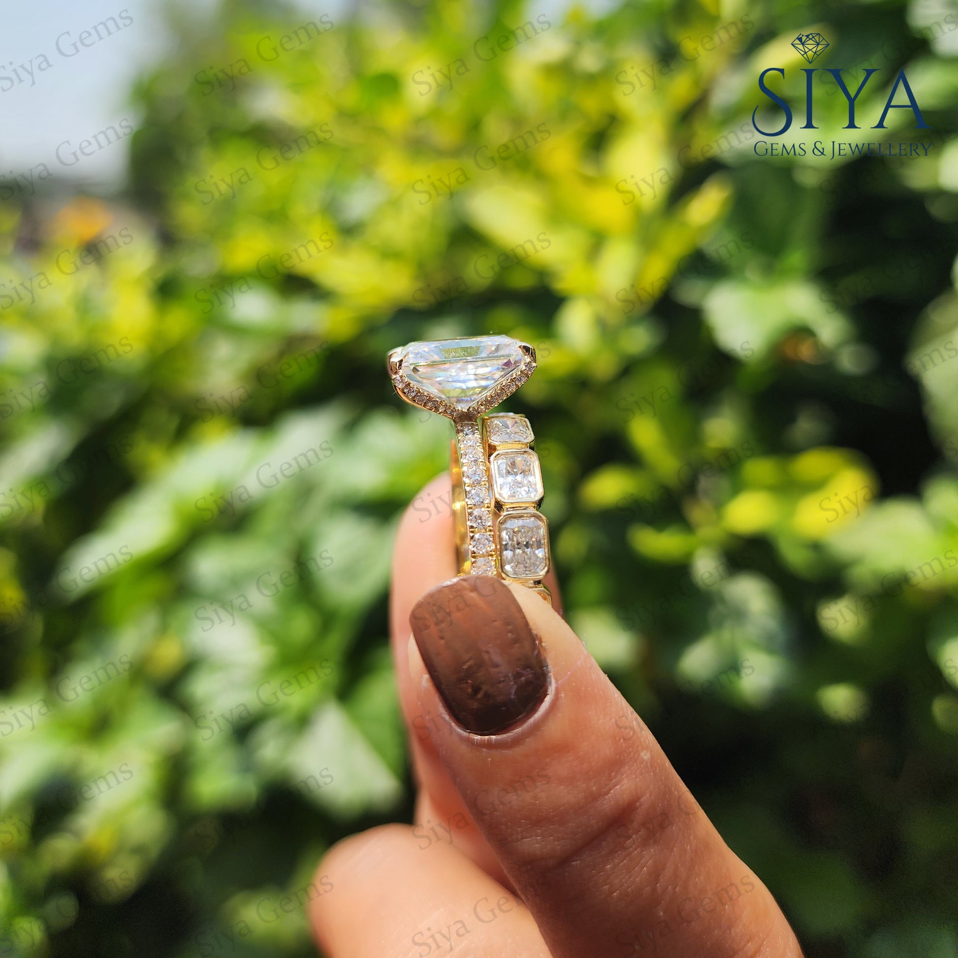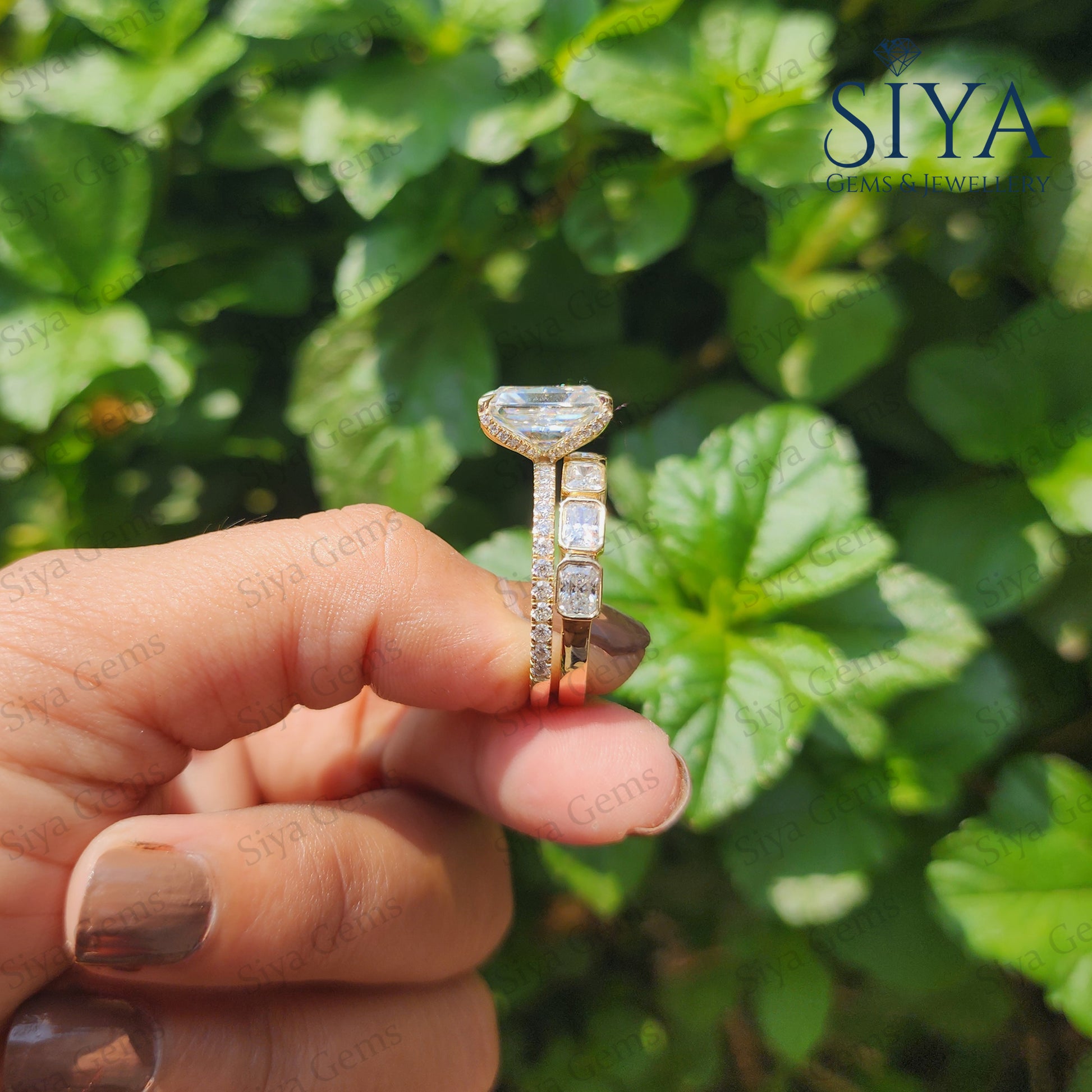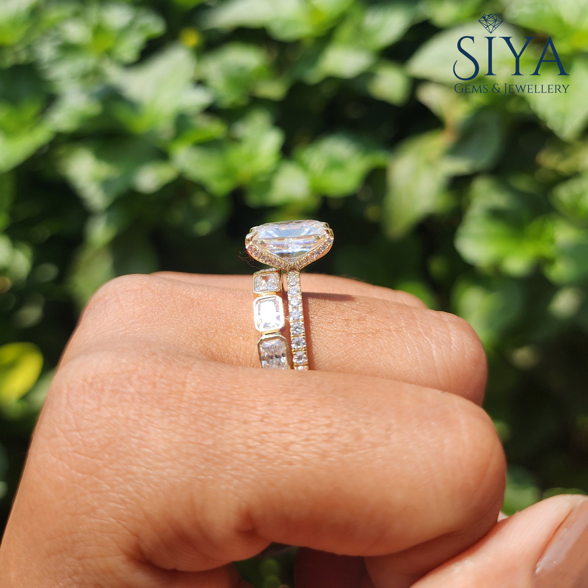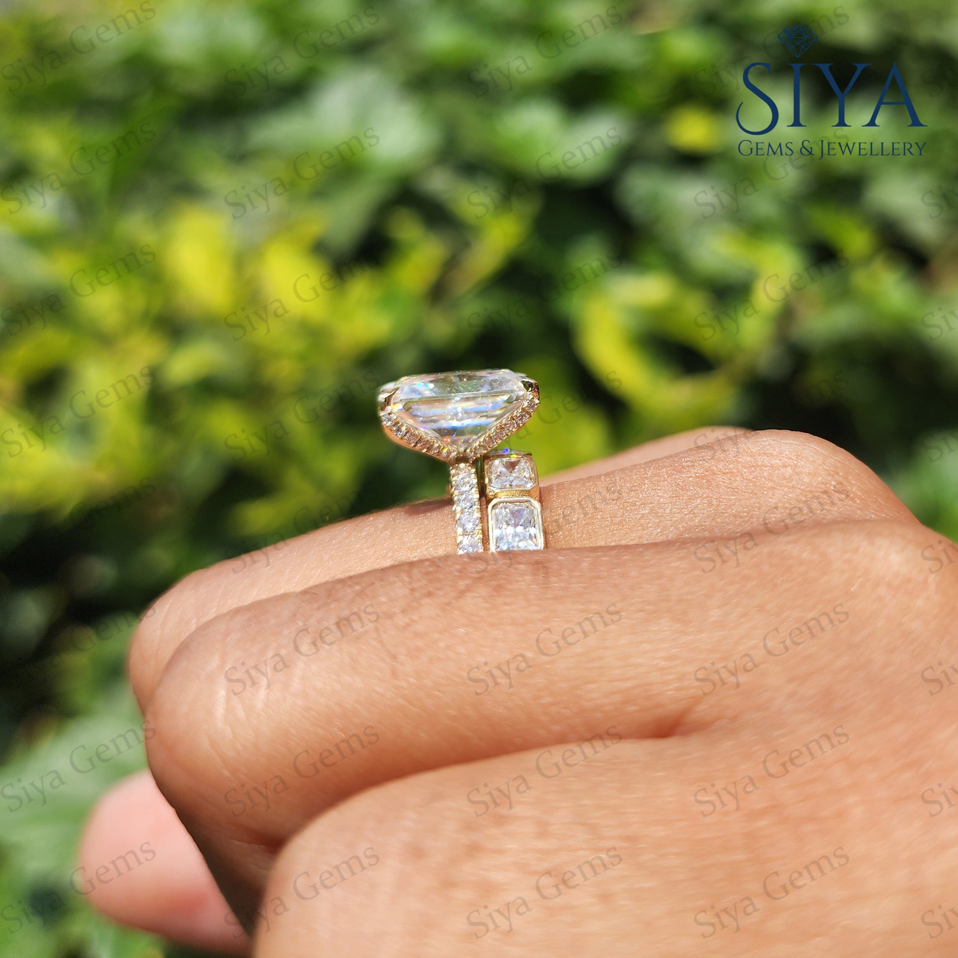 Radiant Cut 3CT Moissanite Engagement Ring Bridal Set, beautifully crafted in luxurious yellow gold. Featuring a dazzling radiant-cut center stone with exceptional brilliance and clarity, this elegant ring set is designed to capture attention from every angle.